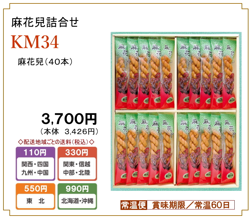「麻花兒詰合せ」KM34(マファール・よりよりのセット)〔常温便〕 ツイートする シェアする 販売価格: 3,700円(税込み) 会員価格 (税込み) 通常価格 (税込み) 在庫 商品コード KM34 JANコード 数量 - + カートに入れる カテゴリー 〔常温〕ギフト(麻花兒・中華菓子・ちゃんぽん・皿うどんのセット)