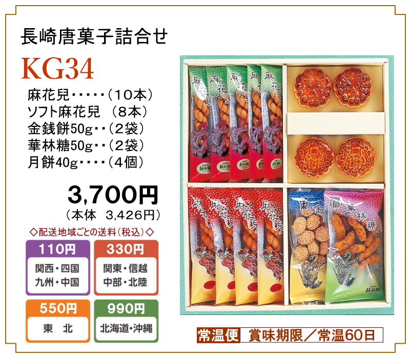 「長崎唐菓子詰合せ」KG34(麻花兒・金銭餅・華林糖・月餅のセット)〔常温便〕 ツイートする シェアする 販売価格: 3,700円(税込み) 会員価格 (税込み) 通常価格 (税込み) 在庫 商品コード KG34 JANコード 数量 - + カートに入れる カテゴリー 〔常温〕ギフト(麻花兒・中華菓子・ちゃんぽん・皿うどんのセット)