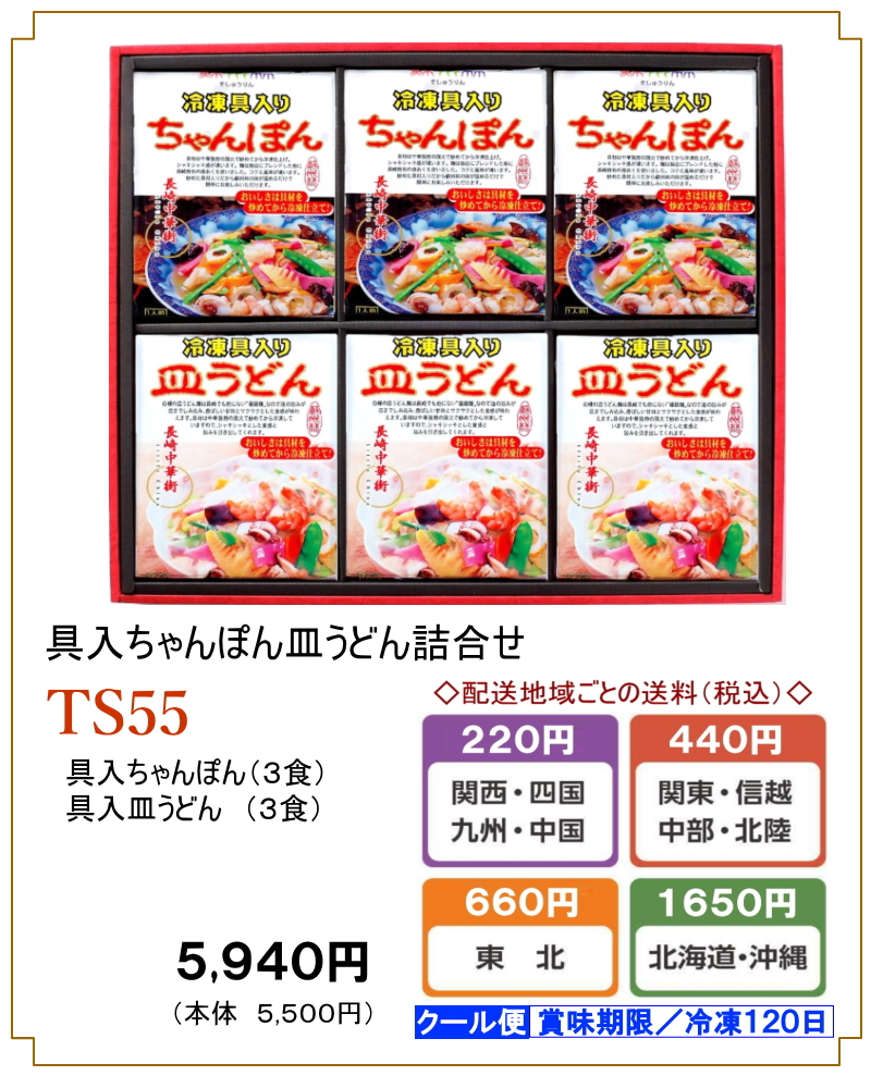 「具入ちゃんぽん・皿うどん詰合せ」TS55(具入ちゃんぽん・具入皿うどんのセット)〔クール冷凍便〕 ツイートする シェアする 販売価格: 5,940円(税込み) 会員価格 (税込み) 通常価格 (税込み) 在庫 商品コード TS55 JANコード 数量 - + カートに入れる カテゴリー 〔冷凍〕ギフト(具入ちゃんぽん・具入皿うどん・角煮割包・中華まん・点心のセット)
