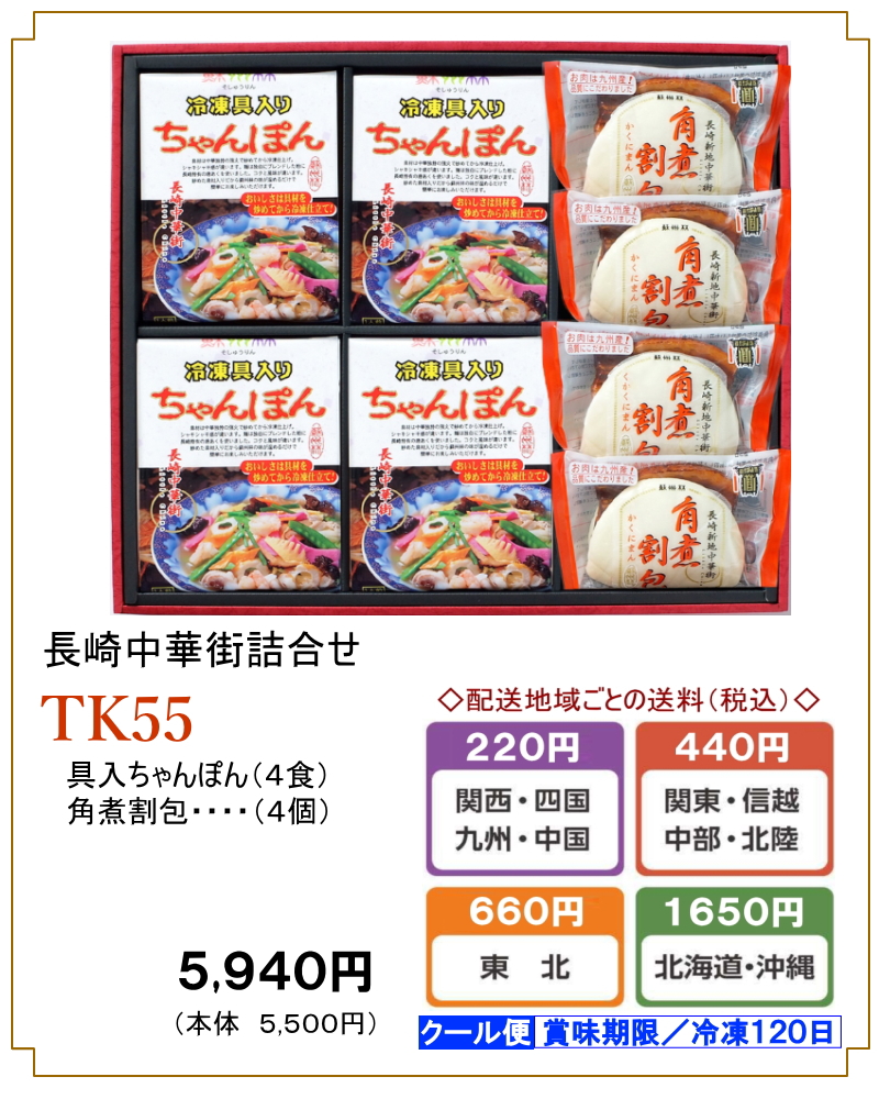 「長崎中華街詰合せ」TK55(具入ちゃんぽん・角煮割包のセット)〔クール冷凍便〕 ツイートする シェアする 販売価格: 5,940円(税込み) 会員価格 (税込み) 通常価格 (税込み) 在庫 商品コード TK55 JANコード 数量 - + カートに入れる カテゴリー 〔冷凍〕ギフト(具入ちゃんぽん・具入皿うどん・角煮割包・中華まん・点心のセット)