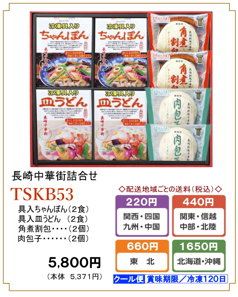 「長崎中華街詰合せ」TSKB53(具入ちゃんぽん・具入皿うどん・角煮割包・肉包子のセット)〔クール冷凍便〕 ツイートする シェアする 販売価格: 5,800円(税込み) 会員価格 (税込み) 通常価格 (税込み) 在庫 商品コード TSKB53 JANコード 数量 - + カートに入れる カテゴリー 〔冷凍〕ギフト(具入ちゃんぽん・具入皿うどん・角煮割包・中華まん・点心のセット)