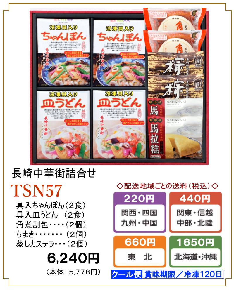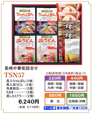 「長崎中華街詰合せ」TSN57(具入ちゃんぽん・具入皿うどん・角煮割包・粽子・蒸しカステラのセット)〔クール冷凍便〕 ツイートする シェアする 販売価格: 6,240円(税込み) 会員価格 (税込み) 通常価格 (税込み) 在庫 商品コード TSN57 JANコード 数量 - + カートに入れる カテゴリー 〔冷凍〕ギフト(具入ちゃんぽん・具入皿うどん・角煮割包・中華まん・点心のセット)