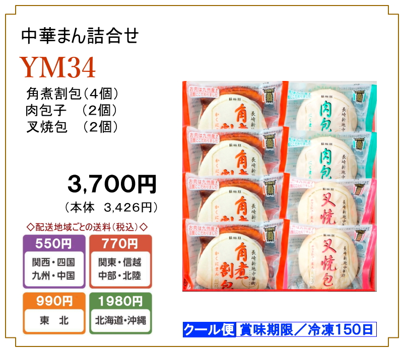 「中華まん詰合せ」YM34(角煮割包・肉包子・叉焼包のセット)〔クール冷凍便〕 ツイートする シェアする 販売価格: 3,700円(税込み) 会員価格 (税込み) 通常価格 (税込み) 在庫 商品コード YM34 JANコード 数量 - + カートに入れる カテゴリー 〔冷凍〕ギフト(具入ちゃんぽん・具入皿うどん・角煮割包・中華まん・点心のセット)