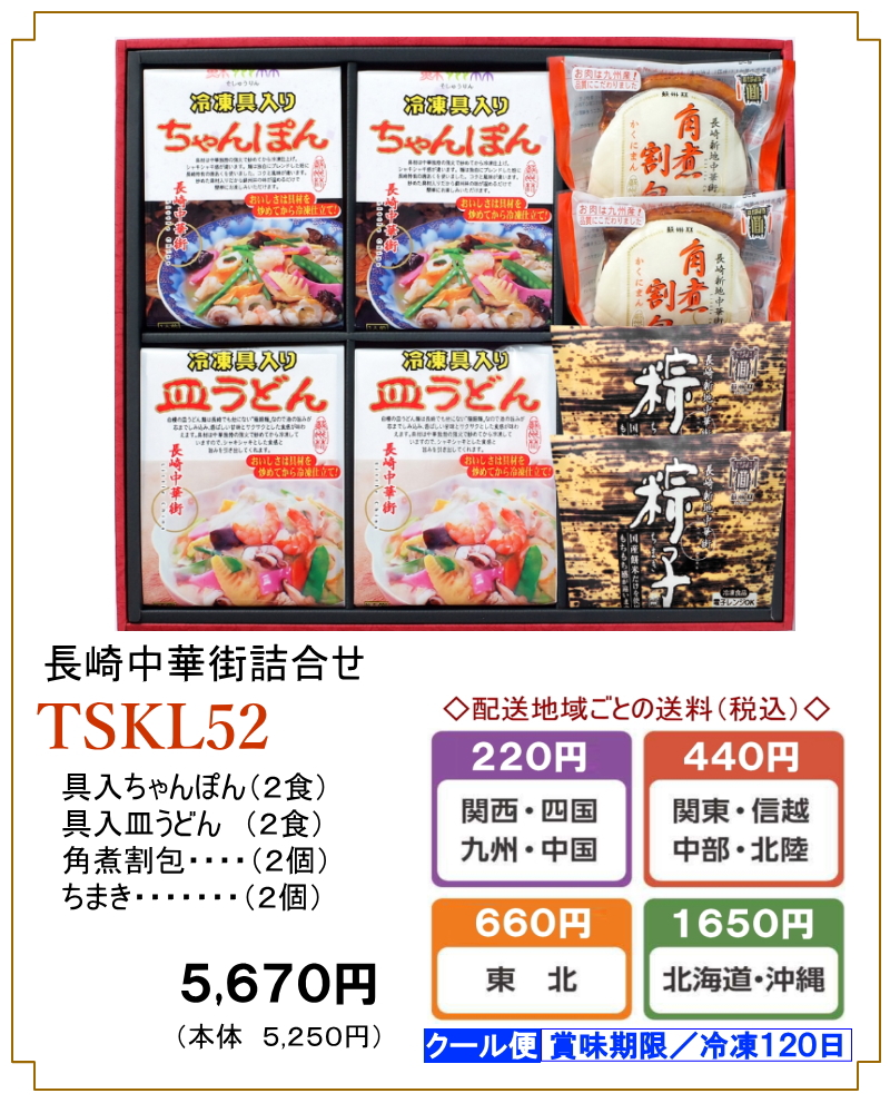「長崎中華街詰合せ」TSKL52(具入ちゃんぽん・具入皿うどん・角煮割包・粽子のセット)〔クール冷凍便〕 ツイートする シェアする 販売価格: 5,670円(税込み) 会員価格 (税込み) 通常価格 (税込み) 在庫 商品コード TSKL52 JANコード 数量 - + カートに入れる カテゴリー 〔冷凍〕ギフト(具入ちゃんぽん・具入皿うどん・角煮割包・中華まん・点心のセット)